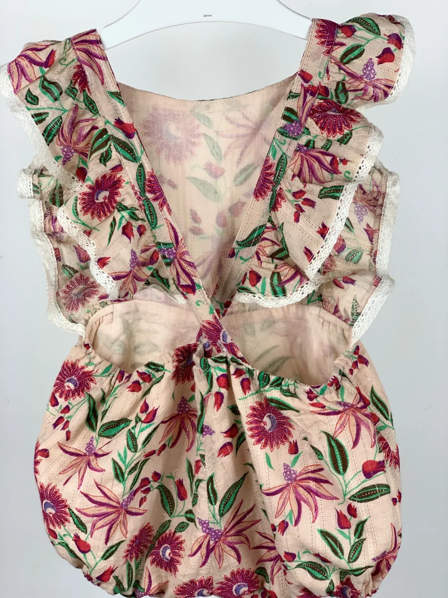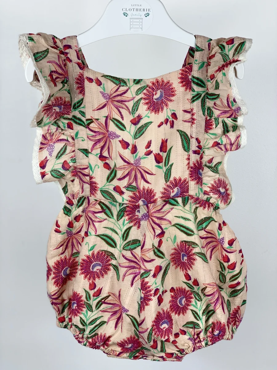 Barboteuse à fleurs rose fushia, vert, à fils de lurex discret, dos croisé et manches volants bordées de dentelle