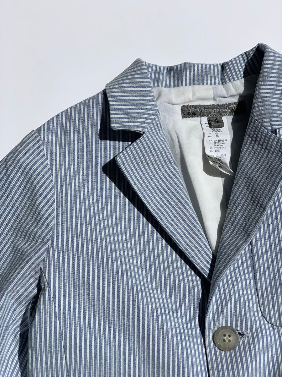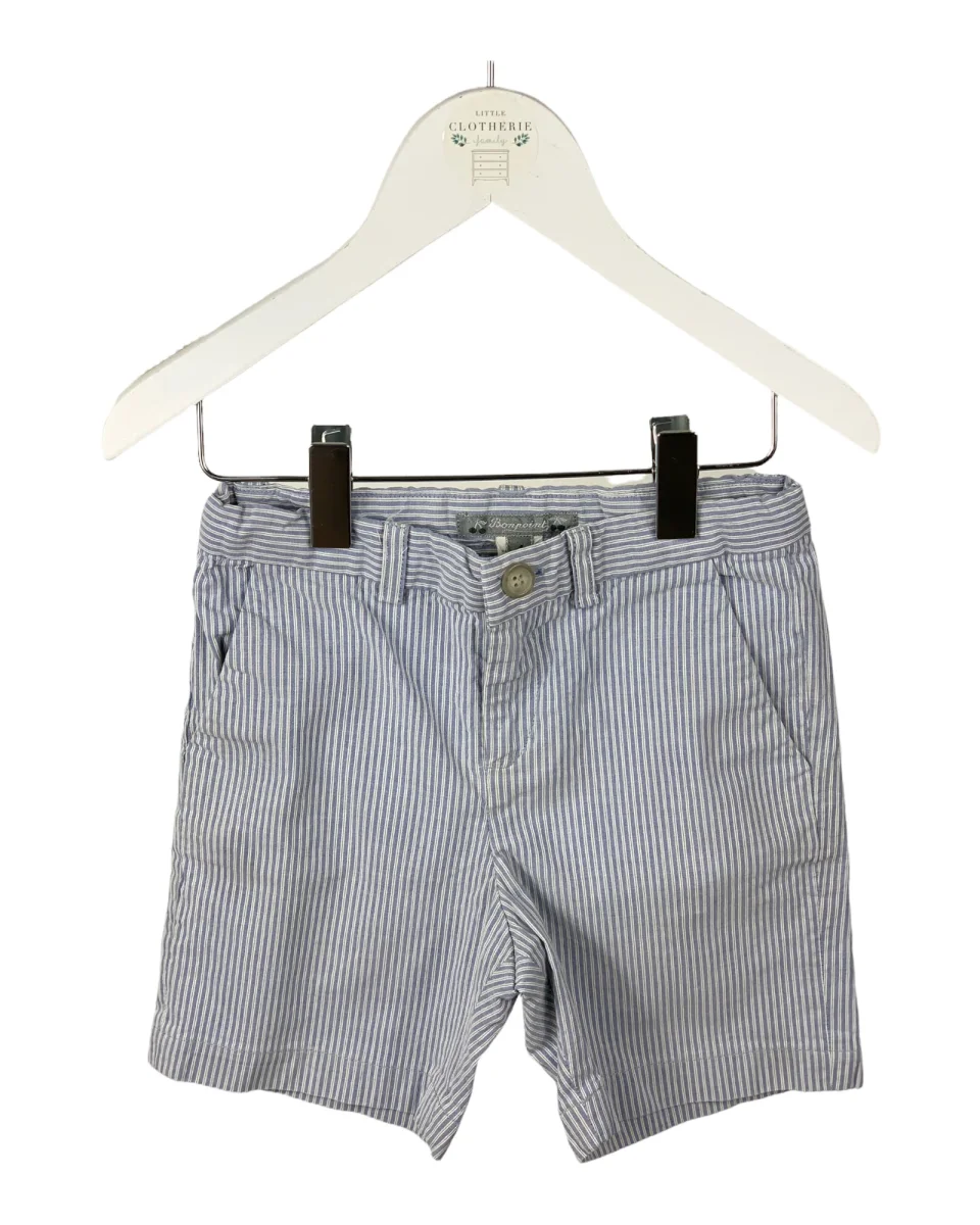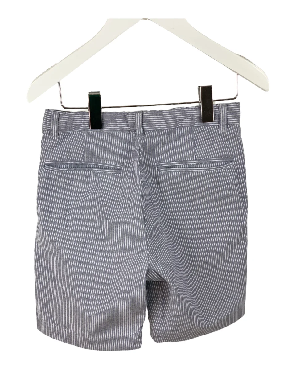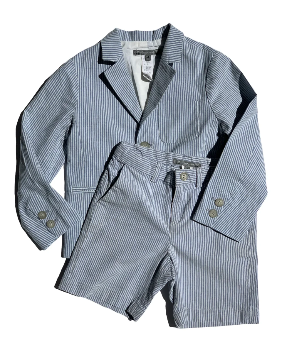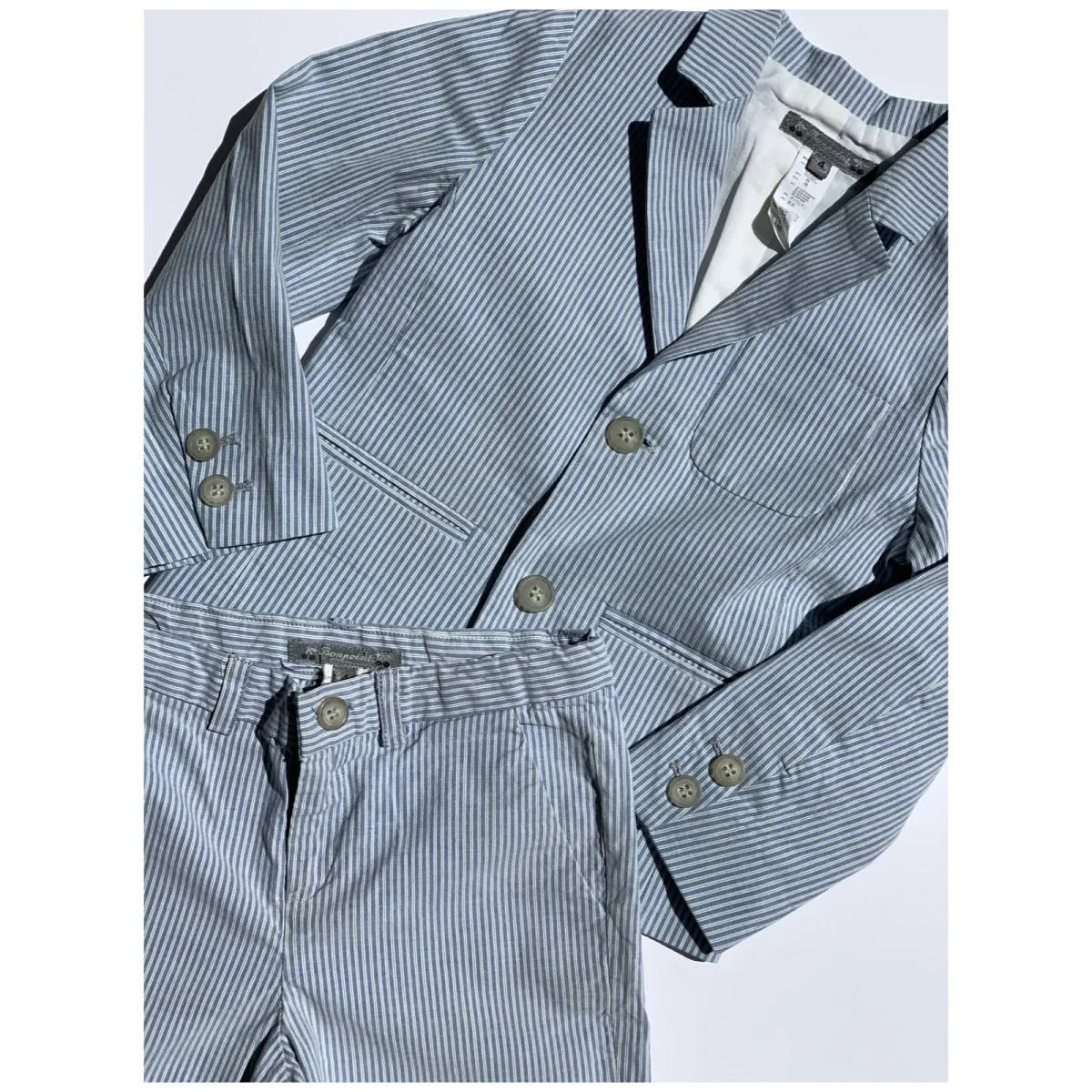 Costume Bonpoint 4 ans rayé bleu et blanc, en coton, avec bermuda 2 poches arrière, élastique à la taille pour resserrer, veste boutons clair, fente arrière,