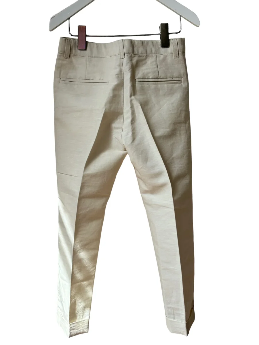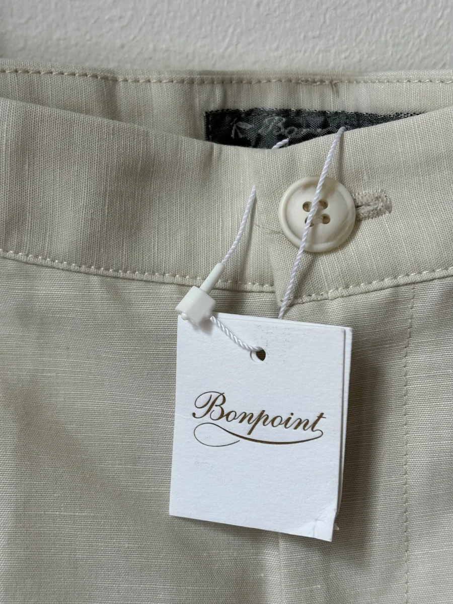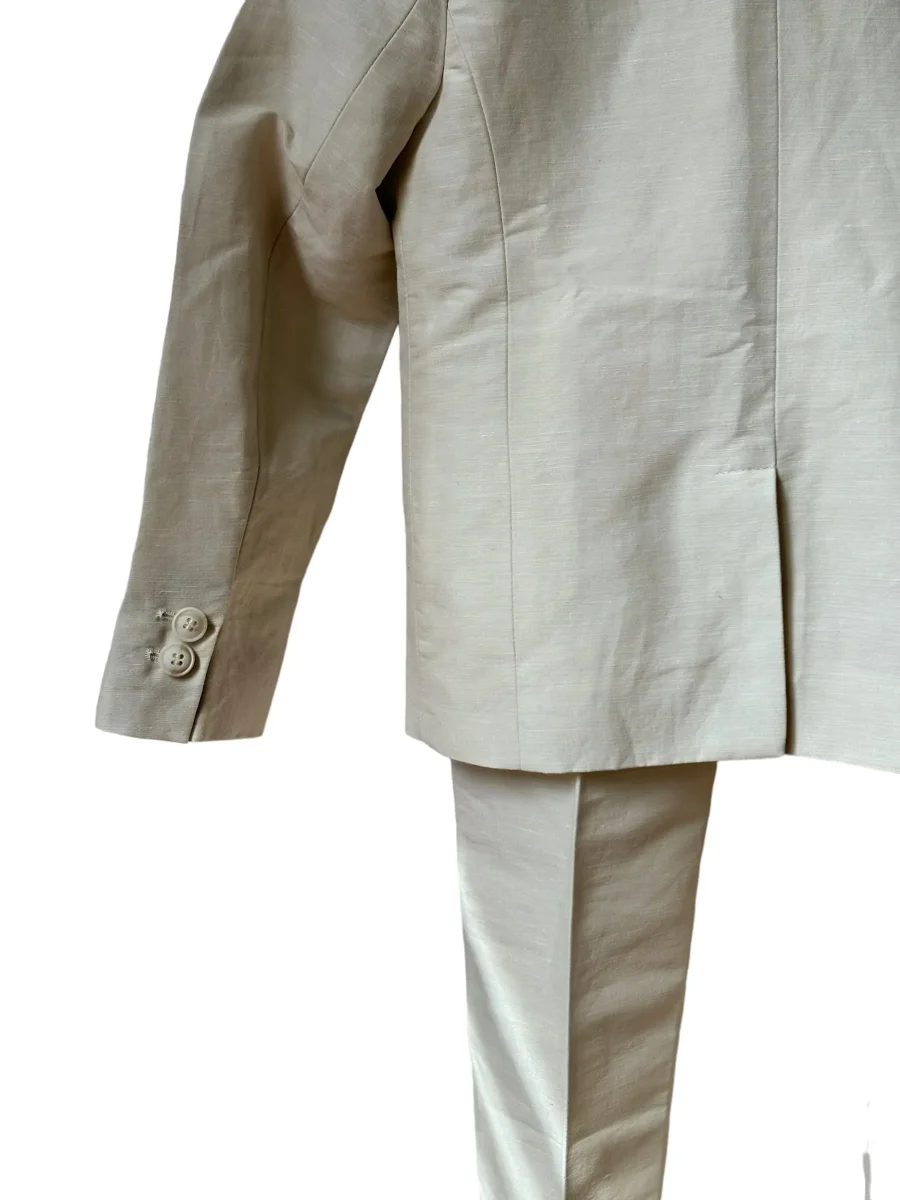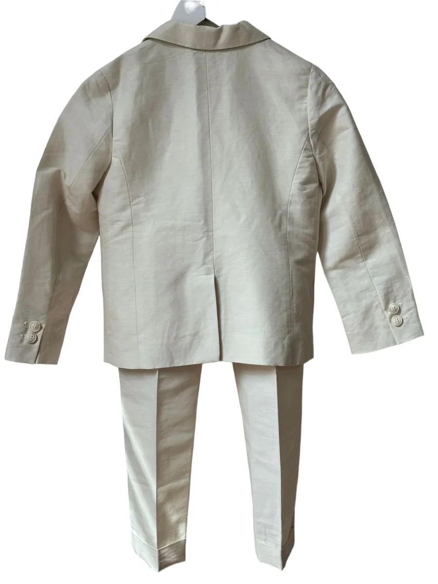Costume Bonpoint en Lin et Coton couleur blanc crème (lait), composé d’un pantalon avec elastique intégré , poches plates, revers en bas du pantalon, coupe assez ajustée, et d’une veste assortie 3 boutons, Modèle EMILE