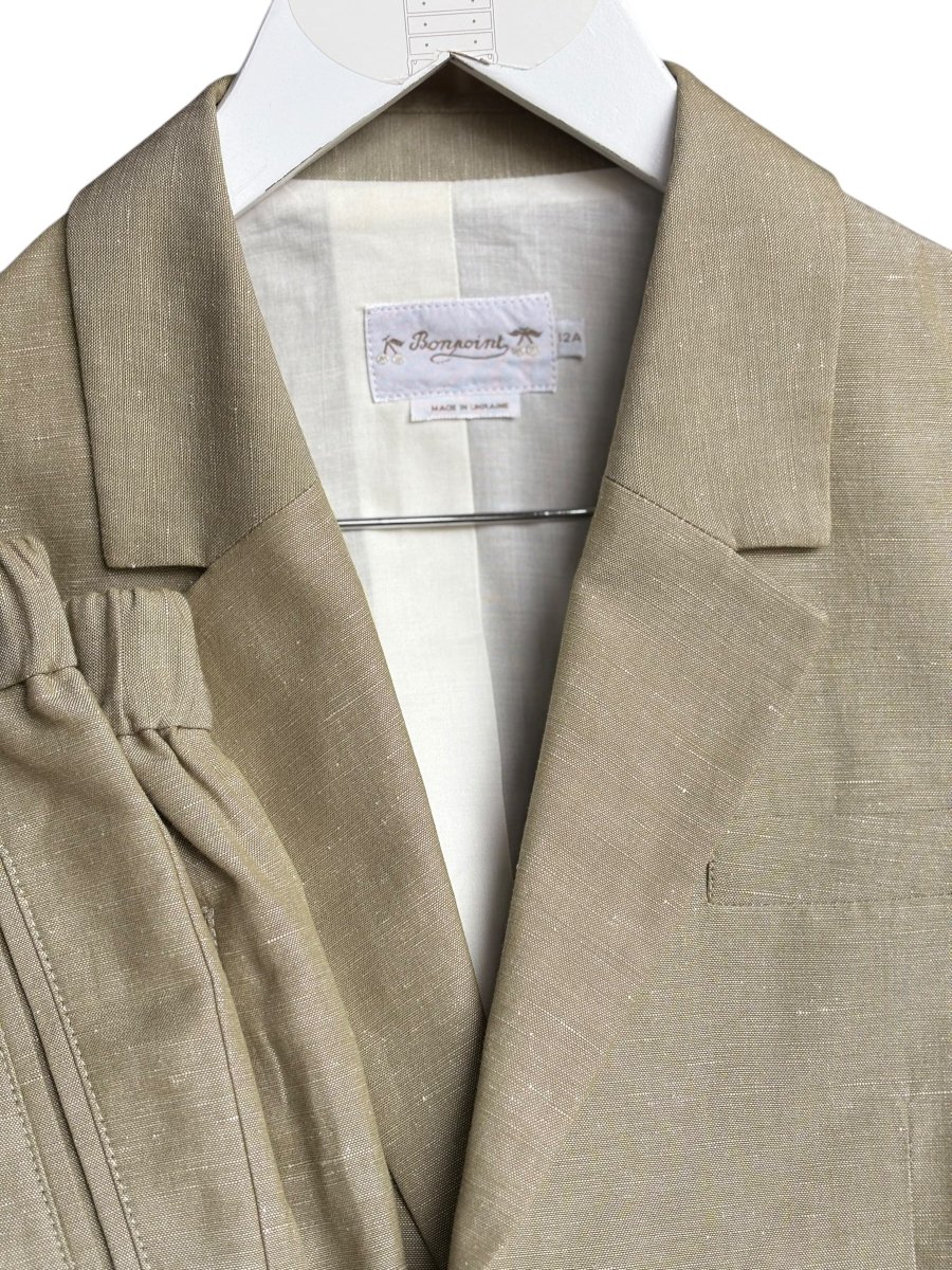 Costume Bonpoint en coton et lin kaki clair, composé d’une veste 1 bouton modèle Aristide, col à revers, doublée, poches à rabat, fente au dos, en taille 12 ans