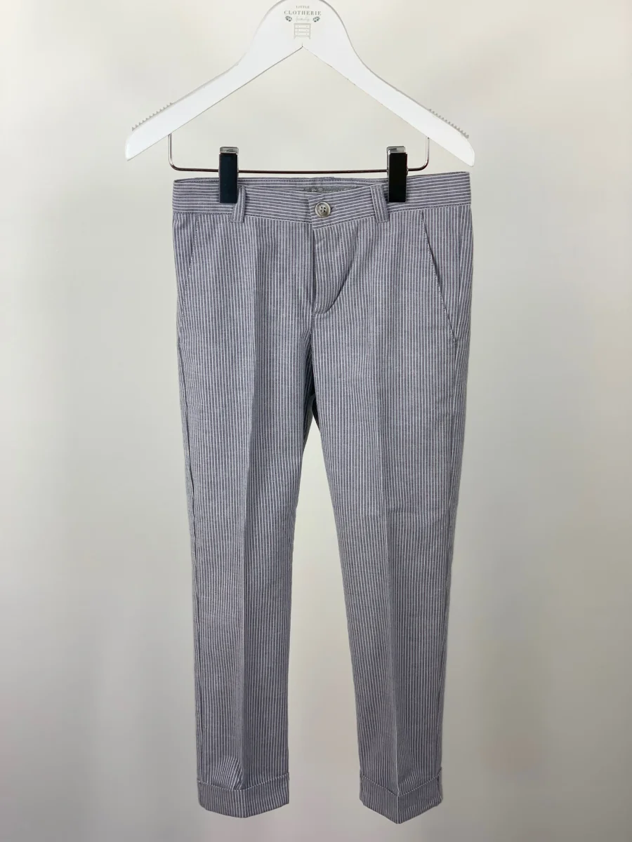 Costume Bonpoint en coton rayé bleu grisé et blanc, composé d’une veste en taille 8 ans 3 boutons, fente au dos, et d’un pantalon (taille 6 ans ) long à revers, 4 poches, élastique à la taille pour resserrer