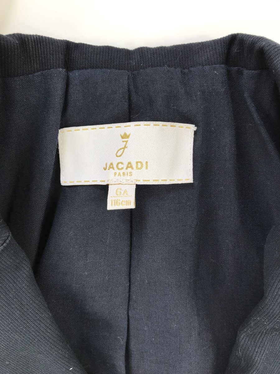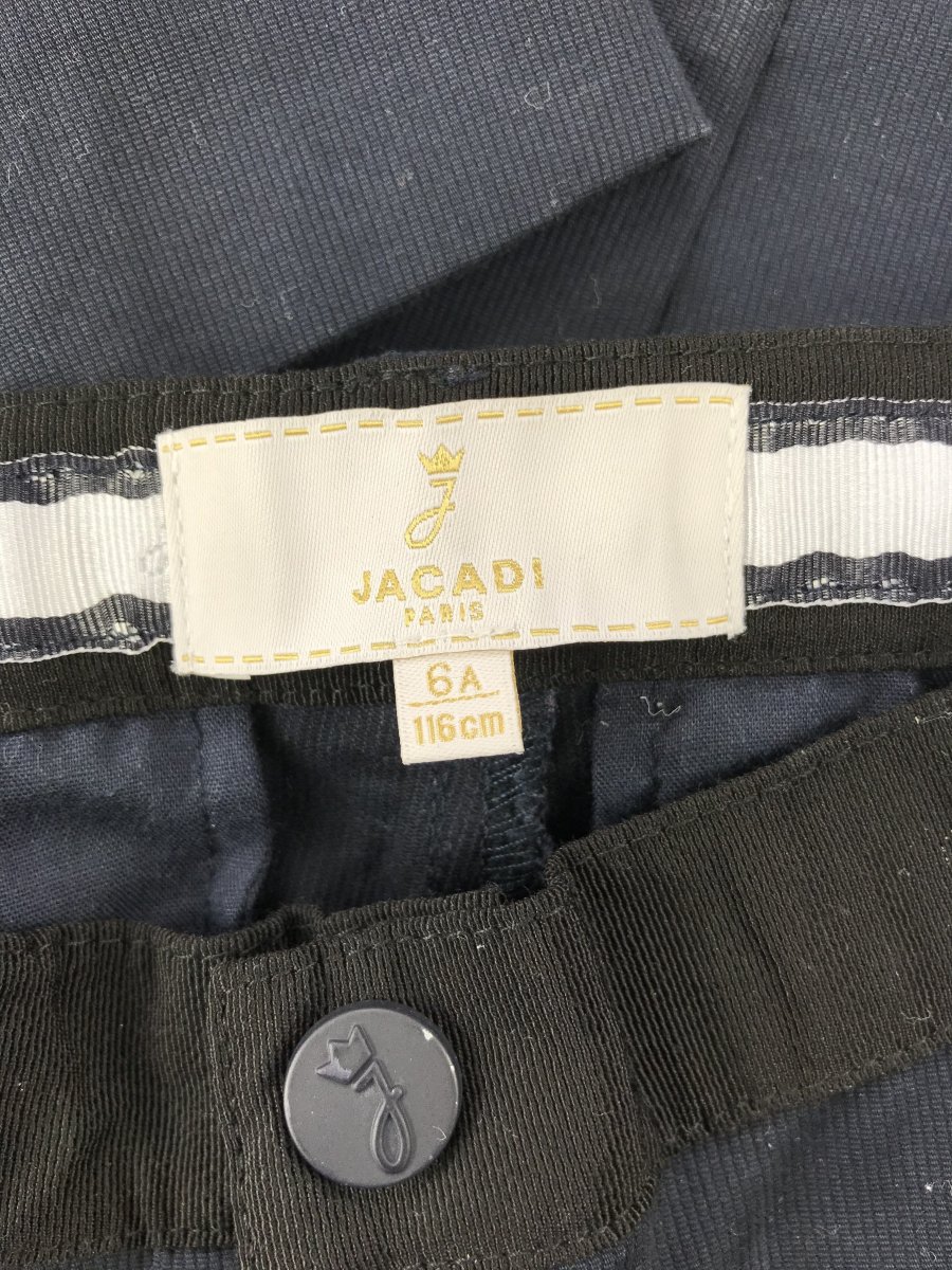Costume bleu marine, en coton, composé d’un pantalon droit à ceinture intégrée gros grain noire, et d’une veste aux jolis boutons monogrammés « J » Jacadi Cérémonie 6 ans Coton Comme neuve A louer pour 4 jours Notre avis : joli tissu pour ce petit costume marine chic !