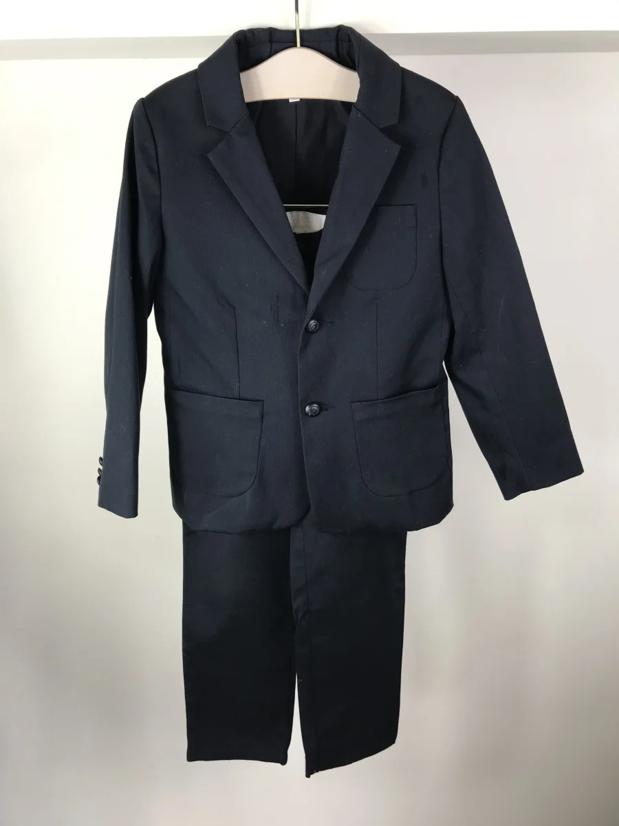 Costume bleu marine, en coton, composé d’un pantalon droit à ceinture intégrée gros grain noire, et d’une veste aux jolis boutons monogrammés « J » Jacadi Cérémonie 8 ans Coton Comme neuve A louer pour 4 jours Notre avis : joli tissu léger (idéal eté ou demi saison) pour ce petit costume marine chic !
