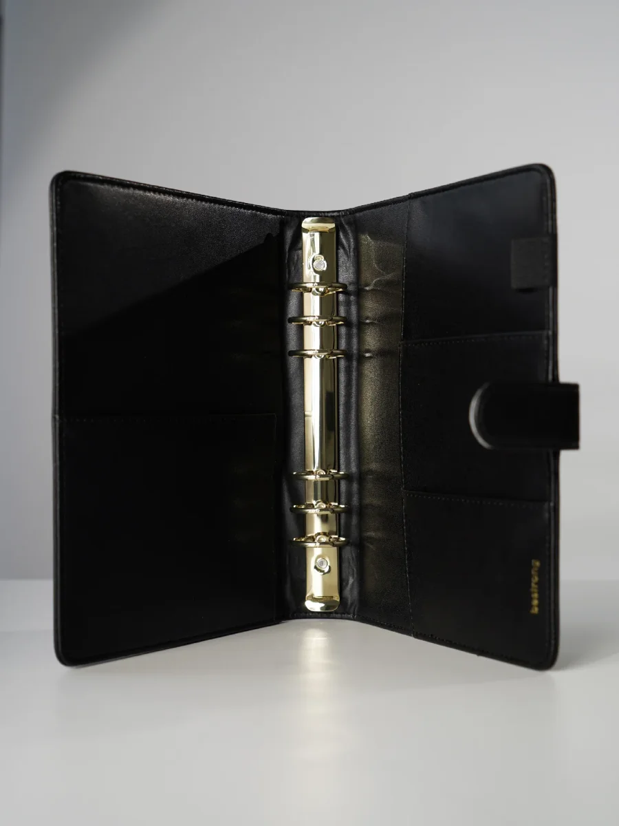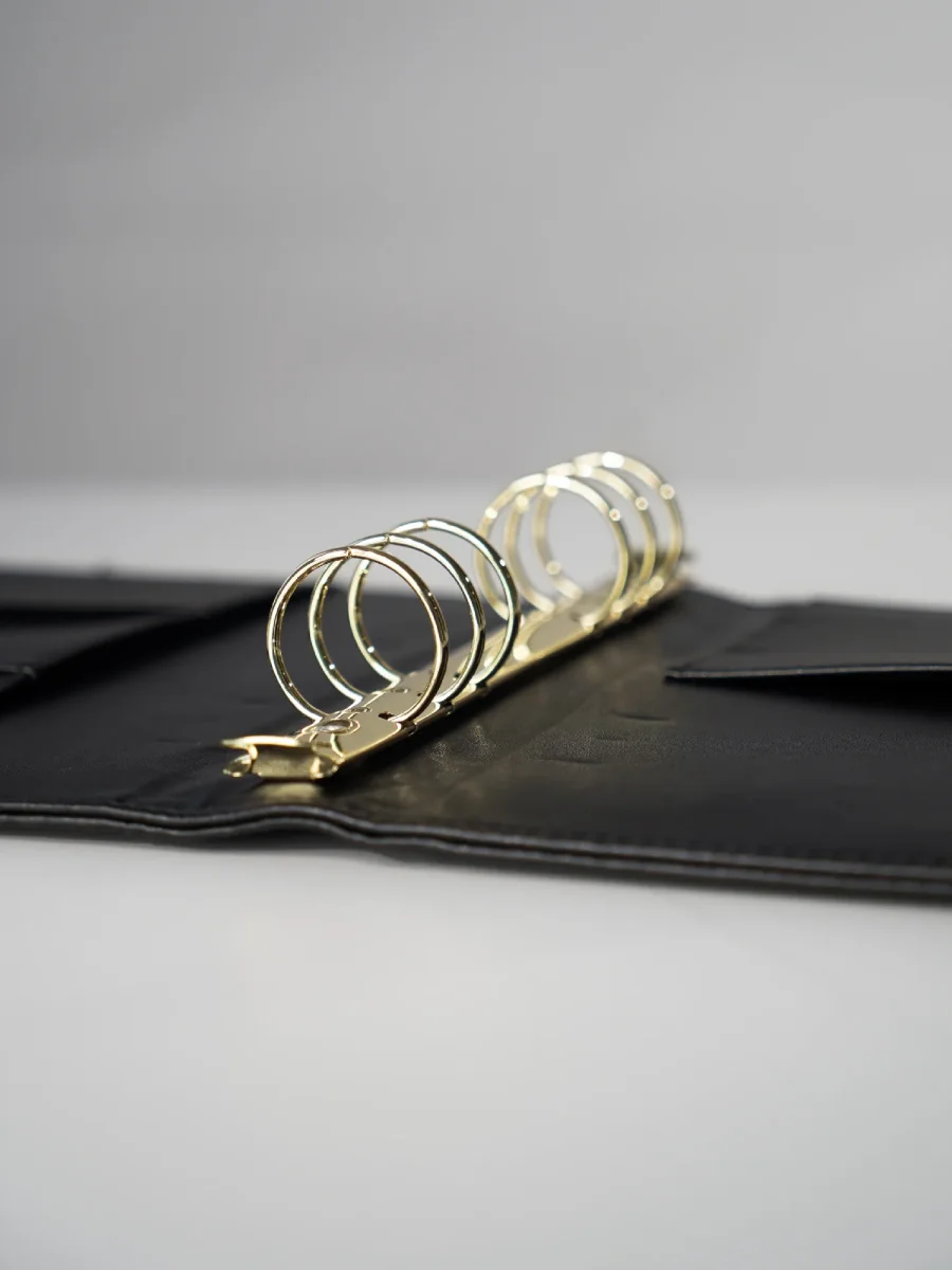 Couverture rigide en simili cuir et anneaux dorés. Poches intérieures et support pour stylo.