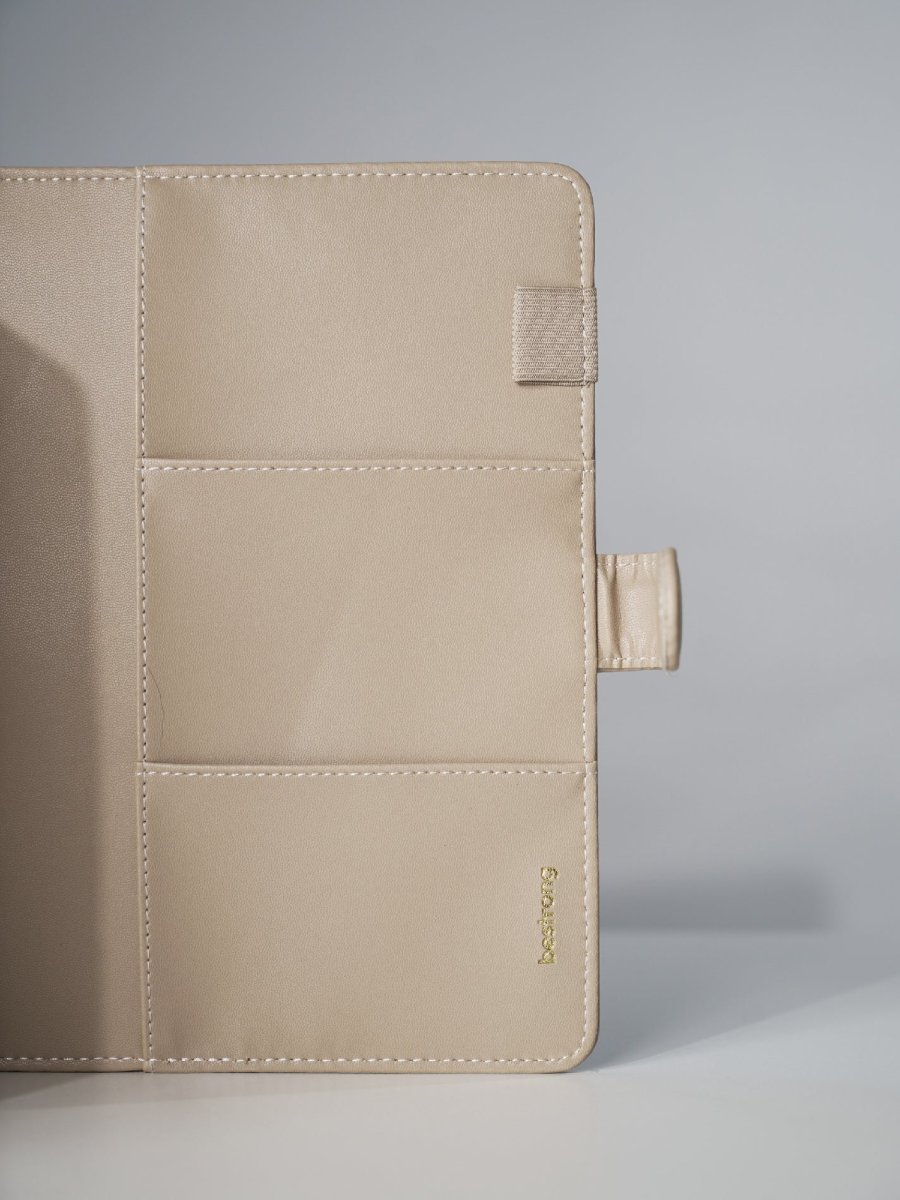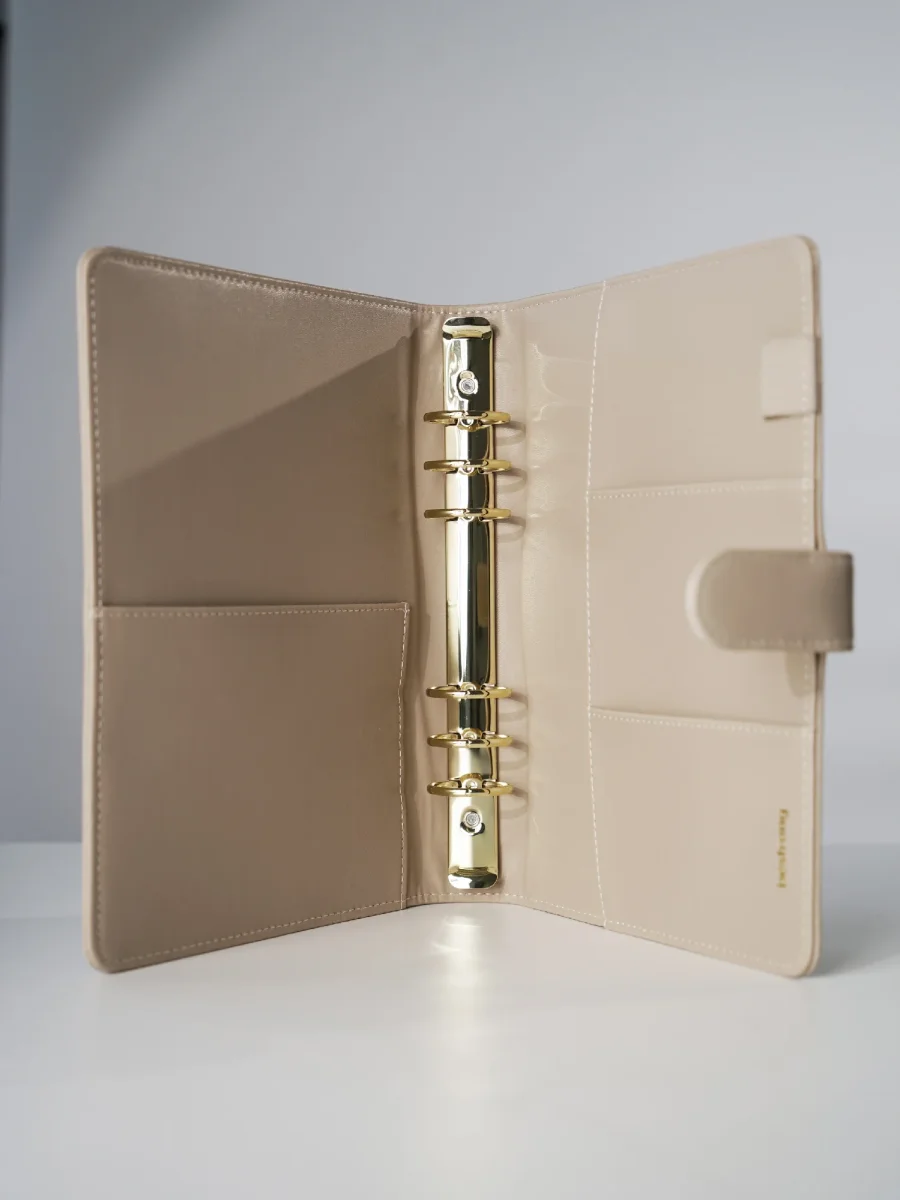 Couverture rigide en simili cuir et anneaux dorés. Poches intérieures et support pour stylo.