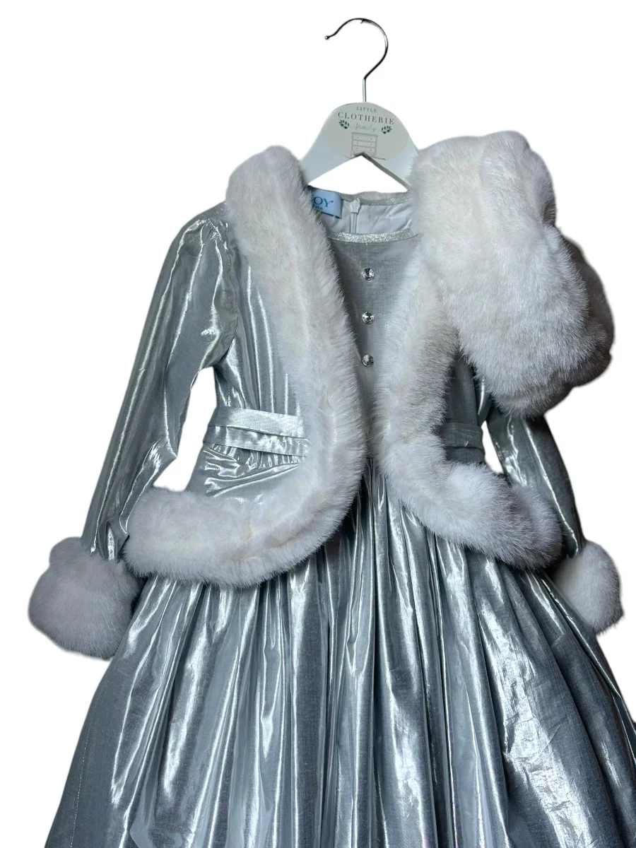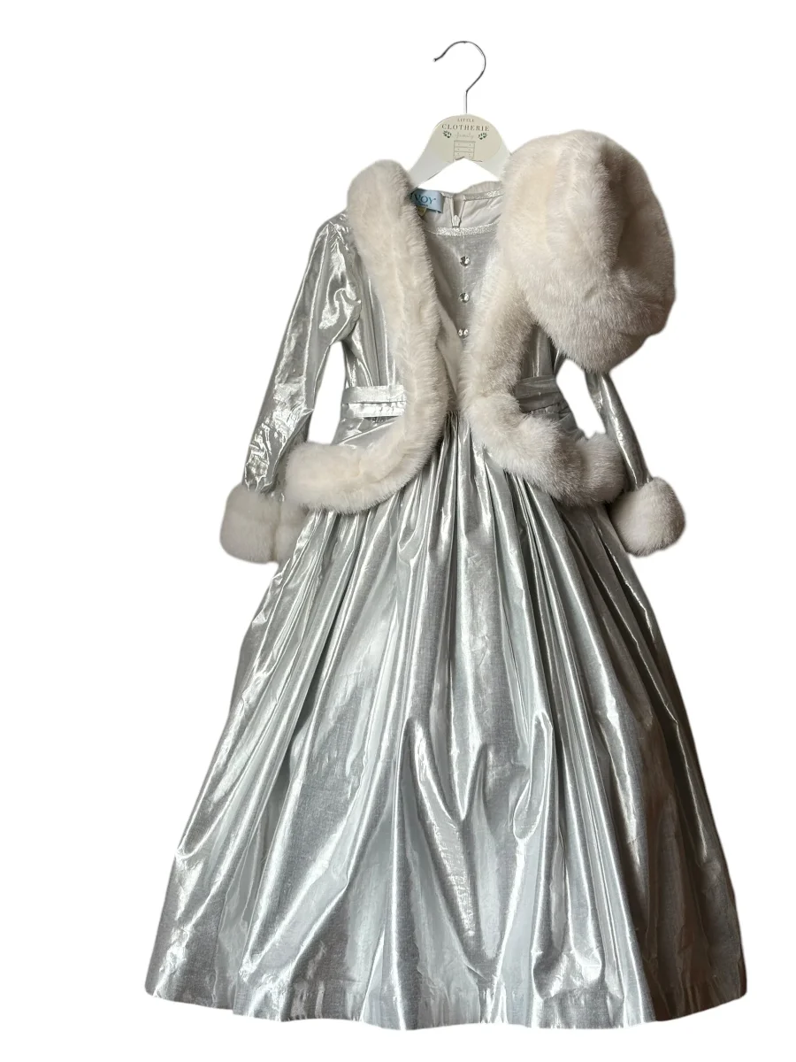 Robe en taffetas gris clair argenté d’inspiration russe. Plastron et manches bordés de fausse fourrure blanche. Toque assortie en fausse fourrure blanche. Plastron orné de cristaux de Swarovski. Jupon agrémenté de deux épaisseurs de tulle et cerceau pour un volume époustouflant.Corsage entièrement doublé de coton pour un grand confort. Ourlet du bas de la jupe entièrement réalisé à la main.