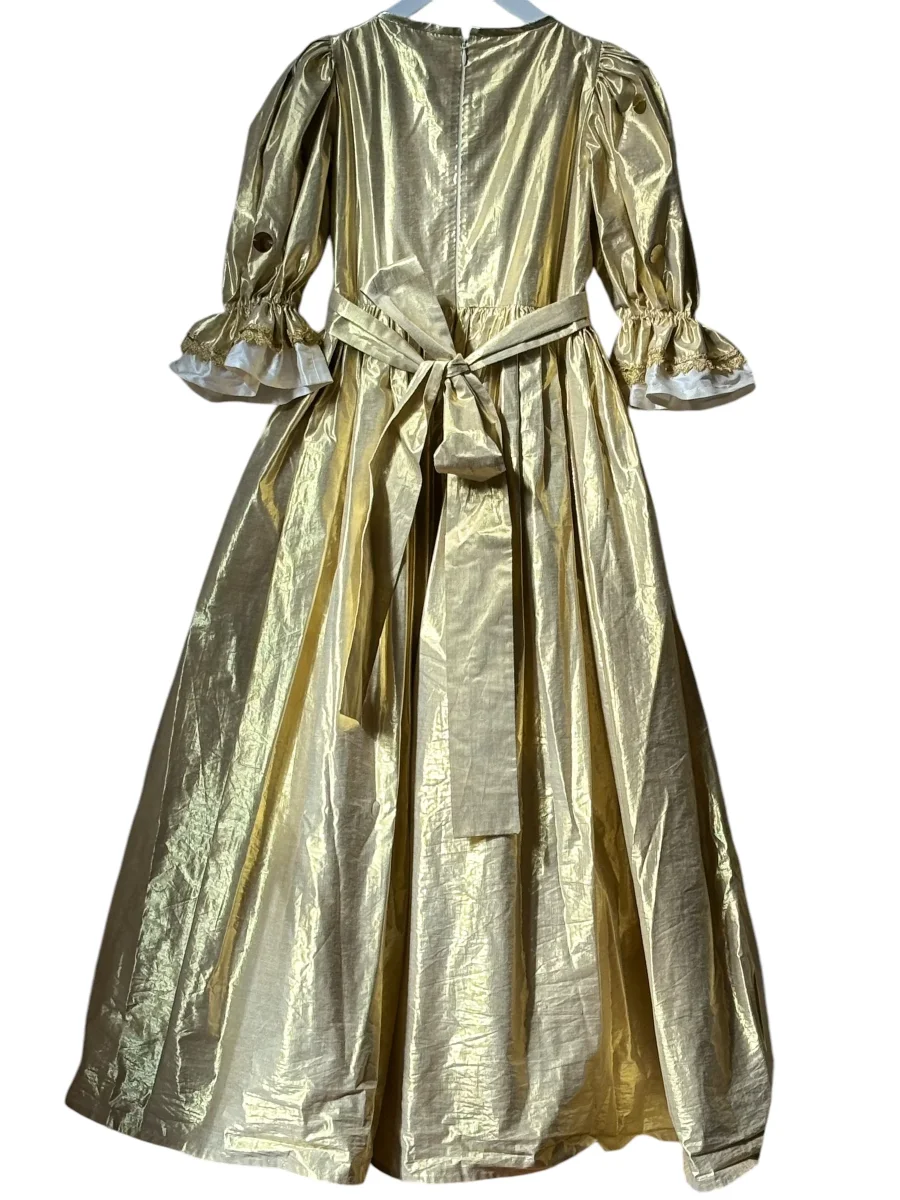 Robe à traîne en lamé or et soie blanc cassé. Plastron en soie bordé de dentelle or. Manches volumineuses brodées de délicats sequins dorés cousus à la main. Jupon agrémenté de deux épaisseurs de tulle pour un volume époustouflant. Corsage entièrement doublé de voile de coton pour un grand confort. Ourlet du bas de la […]