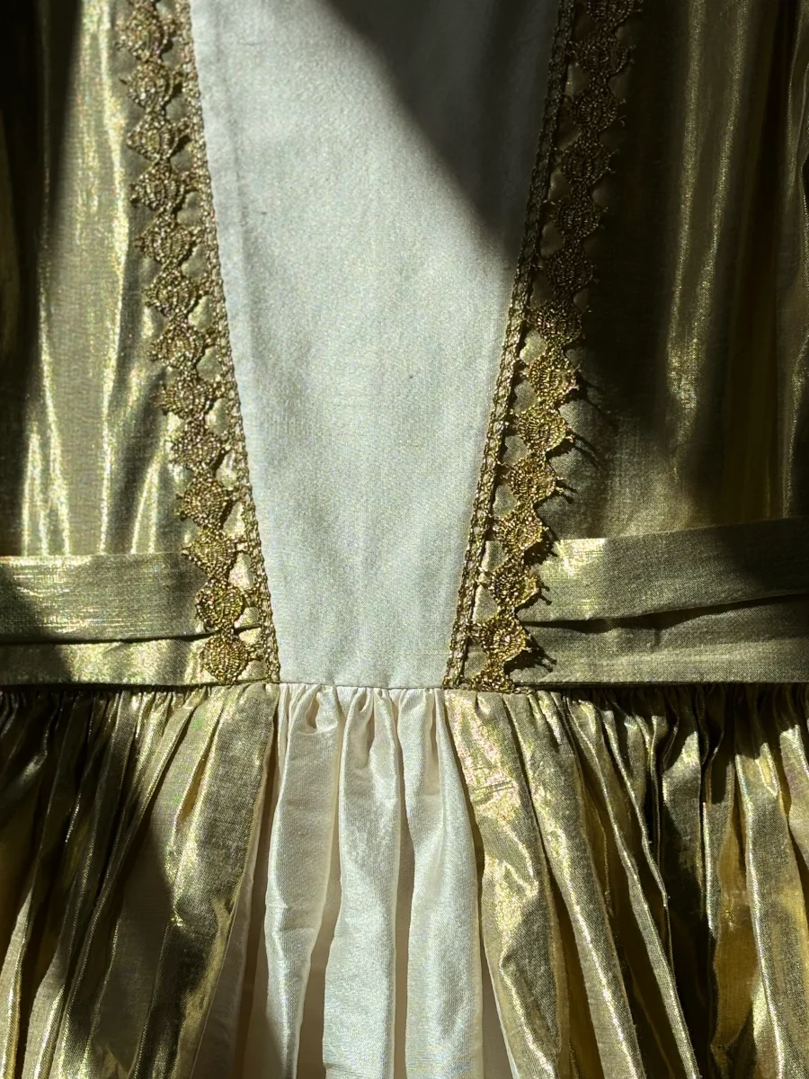 Robe à traîne en lamé or et soie blanc cassé. Plastron en soie bordé de dentelle or.