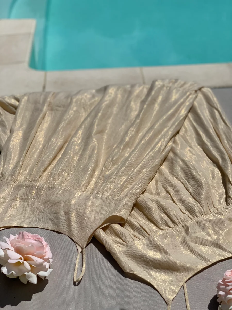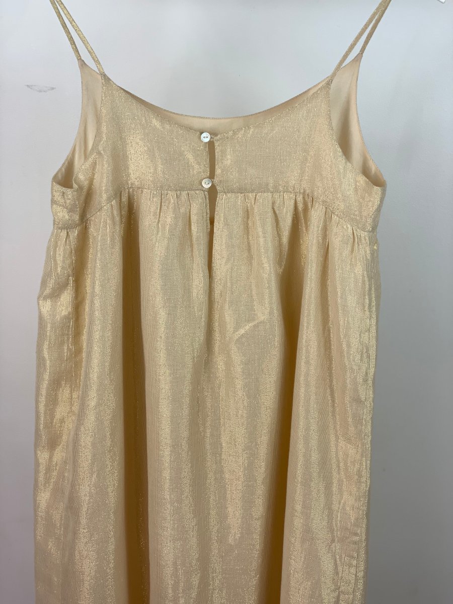 Robe longue dorée, à la coupe ample estivale, en coton fil de lurex doré, à fine bretelles, fermeture au dos par 2 petits boutons