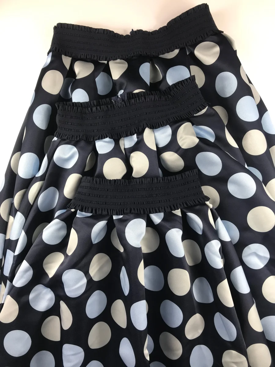 Jupe longue satinée bleu marine à pois bleu ciel et beige