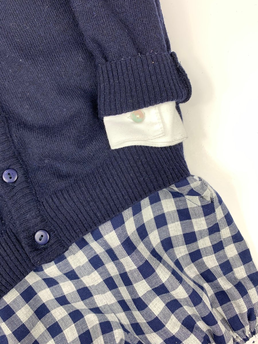 Ensemble 3 pièces : bloomer vichy marine et gris clair, chemisier manches longues bordé marine, cardigan bleu marine en laine et cashmere (4 ans)