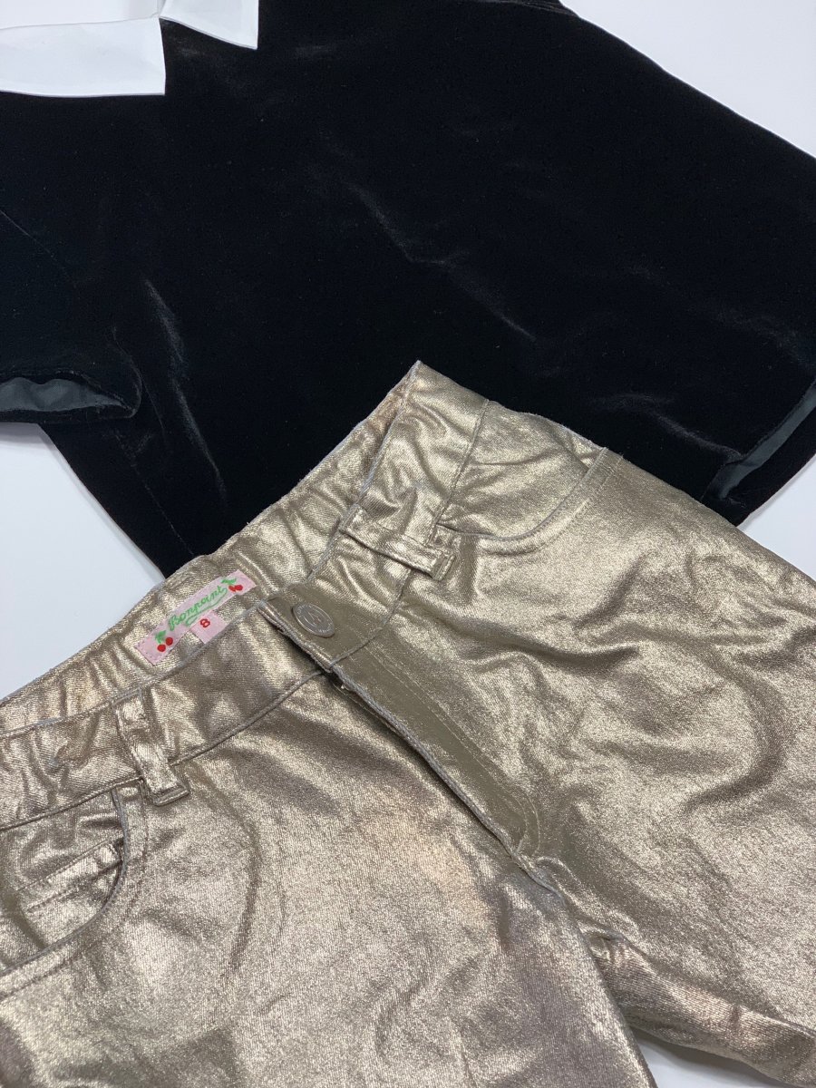 Ensemble composé d’un pantalon doré forme jean, 5 poches, et d’un haut en velours noir à col amovible blanc, boutons noir bijoux au dos