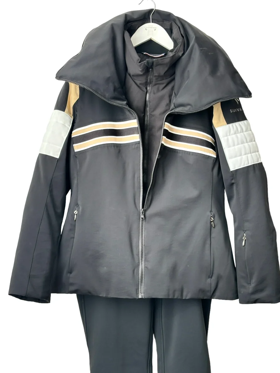 Ensemble composé d’une parka noire, taille L, à double col montant, coupe cintrée féminine, Matière 4-way stretch, Isolant recyclée Thermosoft (120g), Coutures étanches aux endroits stratégiques, Doublure stretch Manches préformées, guêtres de poignet en lycra Poche forfait sur la manche Poche filet pour masque, jupe pare neige fixe montée sur lycra, Essui masque et attache clés