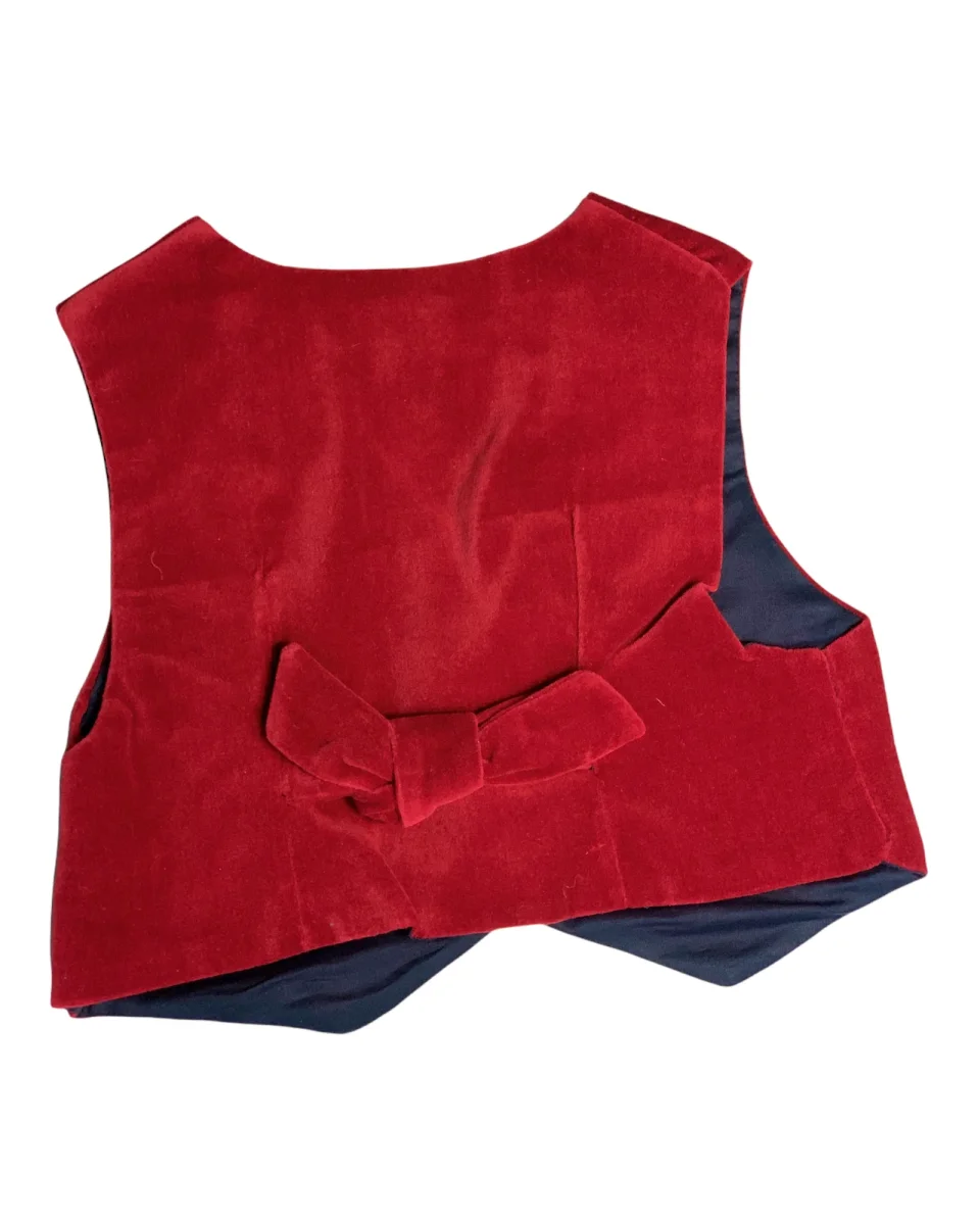 gilet de céremonie rouge ne velours lisse, gros bouton velours, noeud de resserrage au dos Kidiwi 2 ans Neuf A louer pour 4 jours OU 8 jours Notre avis : le petit gilet de cérémonie « comme papa » pour Noel