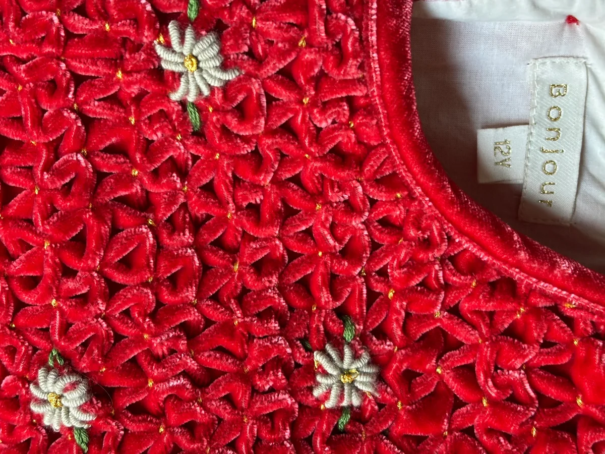 Haut BONJOUR en velours rouge à smocks détails marguerites brodés, coupe ample, manches 3/4 froncées, boutons au dos Taille 10 ans AMAIA Velours Comme neuve A louer pour 4 jours ou 8 jours Avis : le petit haut qu’il nous faut pour les fêtes de fin d’année 🙂