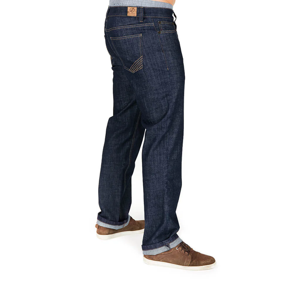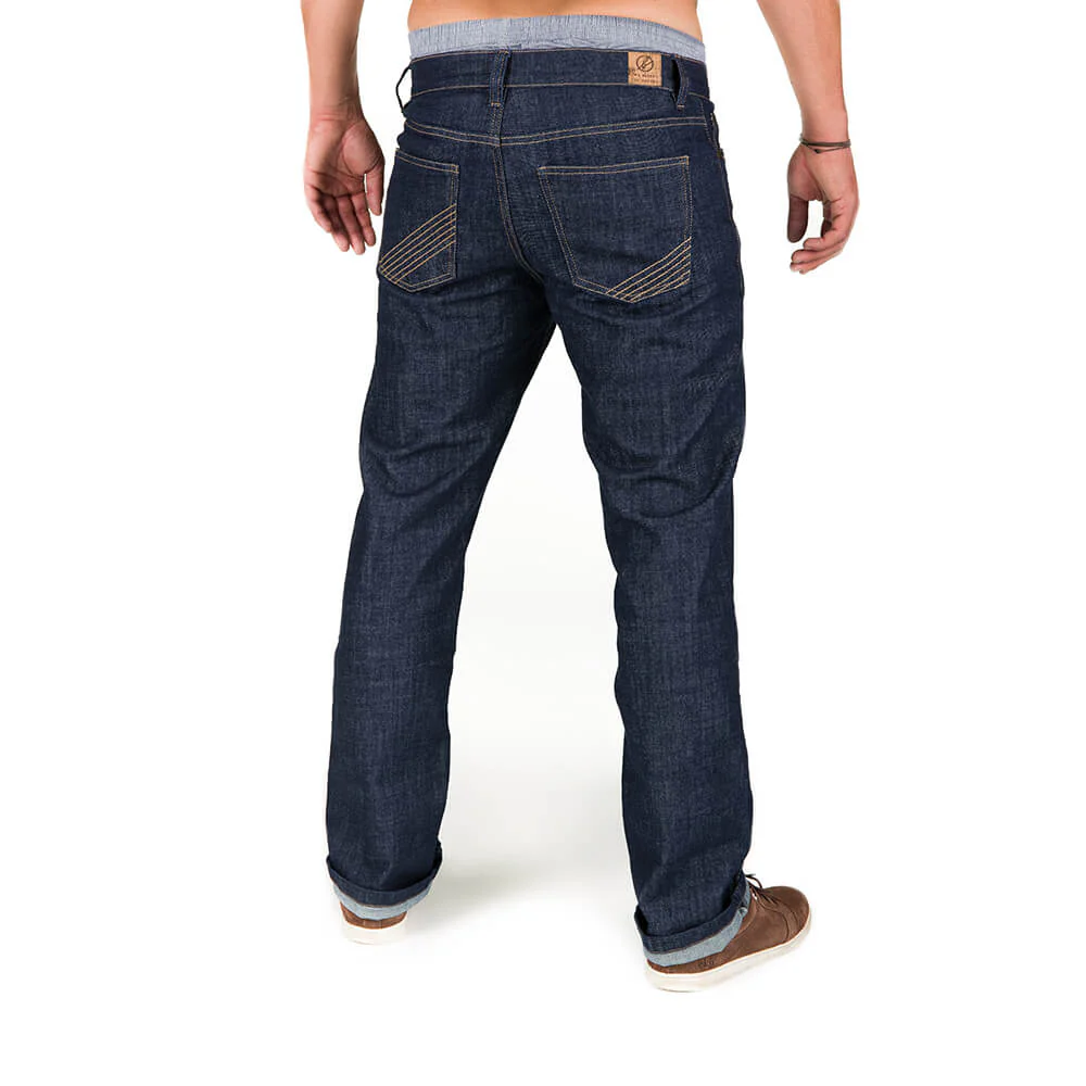 Jean bleu pour homme en coton bio et élasthanne, fabriqué en Europe et certifié GOTS.