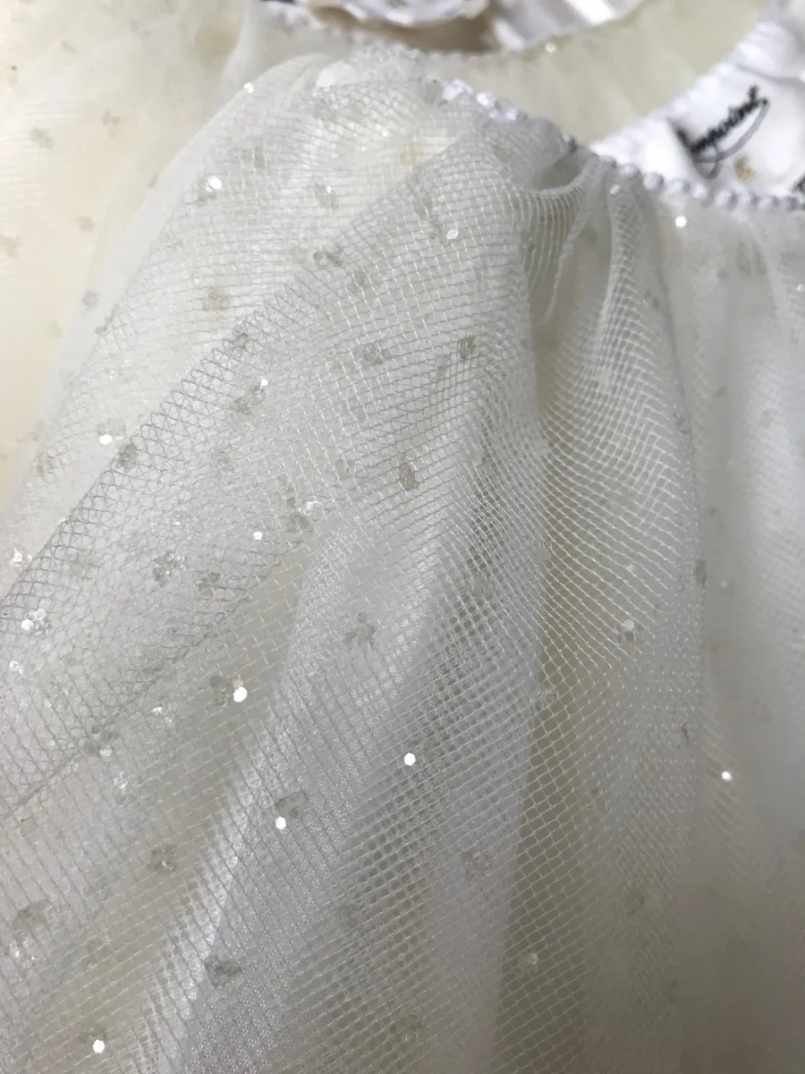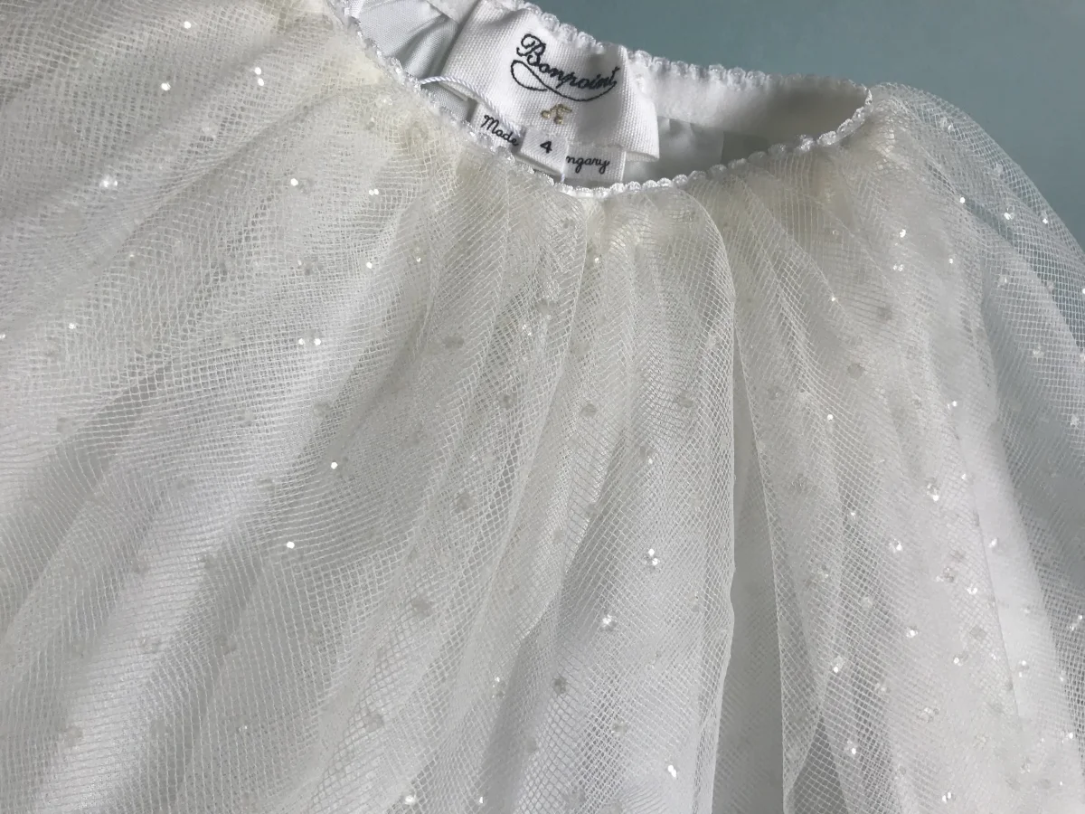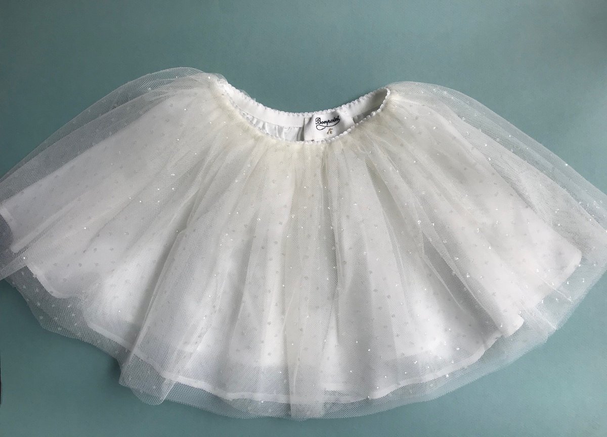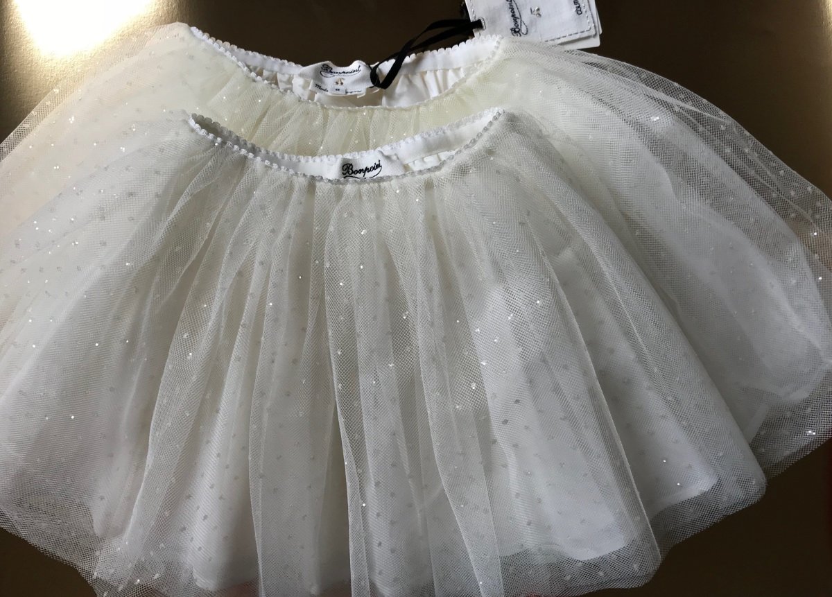 Jupons en tulle blanc pailletés élastiqués à la ceinture, plusieurs épaisseurs de tulle et coton Taille 4 ans et 8 ans Bonpoint Couture Neuf A louer pour 4 jours Avis : un grand classique pour mettre des paillettes dans les yeux des petites filles !