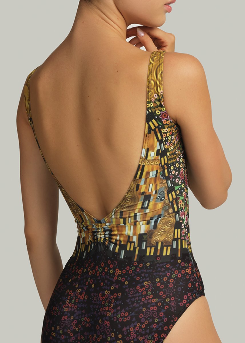 Justaucorps style débardeur à col bateau avec un magnifique dos ouvert mi-long qui comporte également un pincement réglable. Ce vêtement très spécial présente un imprimé inspiré du grand artiste Gustav Klimt.