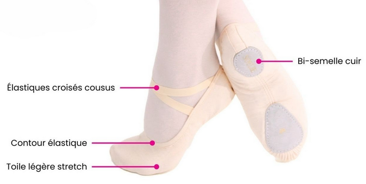 Merlet 1/2 pointe Soélie est issue du savoir faire Merlet.  Elle est conçue avec un dessus en toile rose claire légère extensible.  Les élastiques cousus sont croisés sur le cou-de-pied.