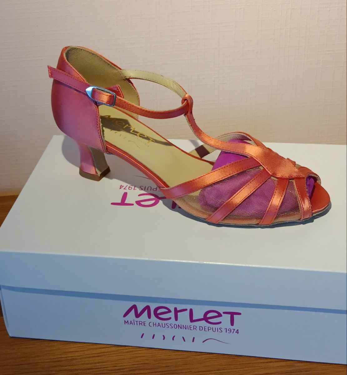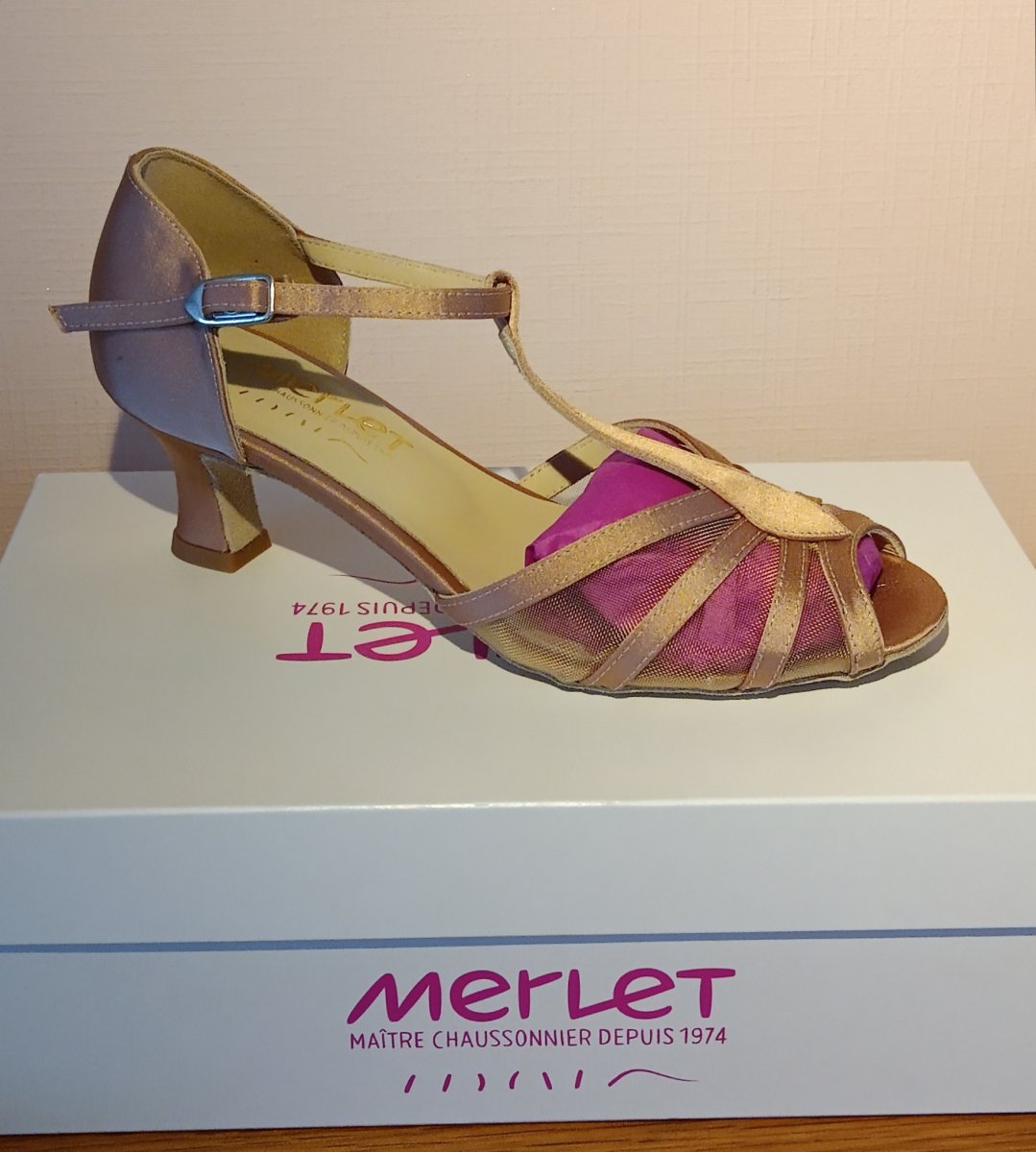 Parce qu’une image vaut mieux qu’un long discours… Merlet Karmina 1730 chaussure de danse de salon en satin et cuir avec semelle en suédine noir ou beige en fonction de la couleur du satin et résille entre les brides. Talon 5 cm. Déclinée dans 13 coloris dont Biche-120; tan 301; corail 330.