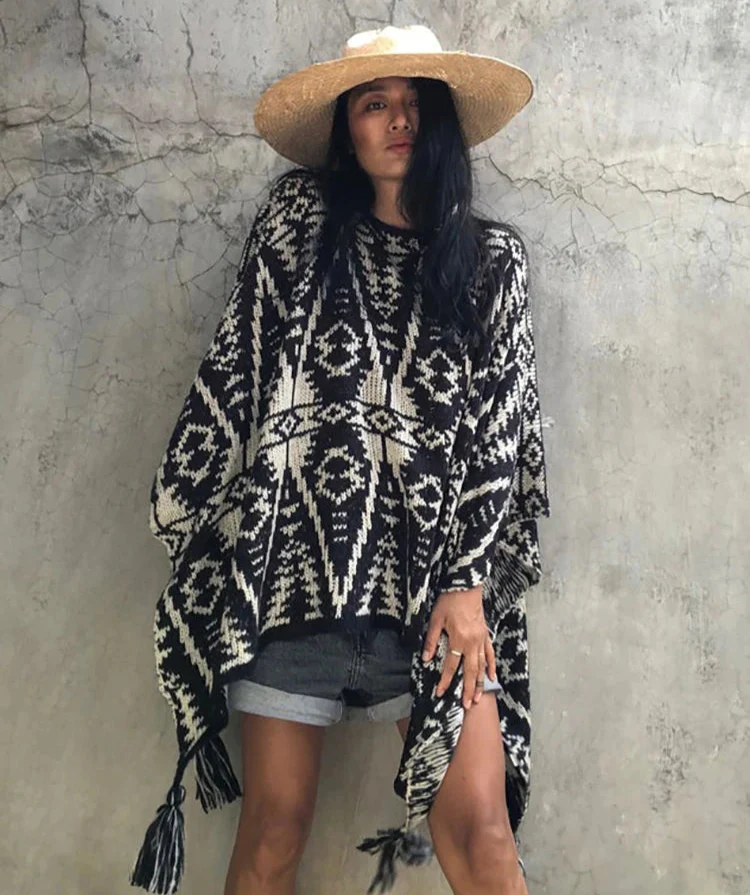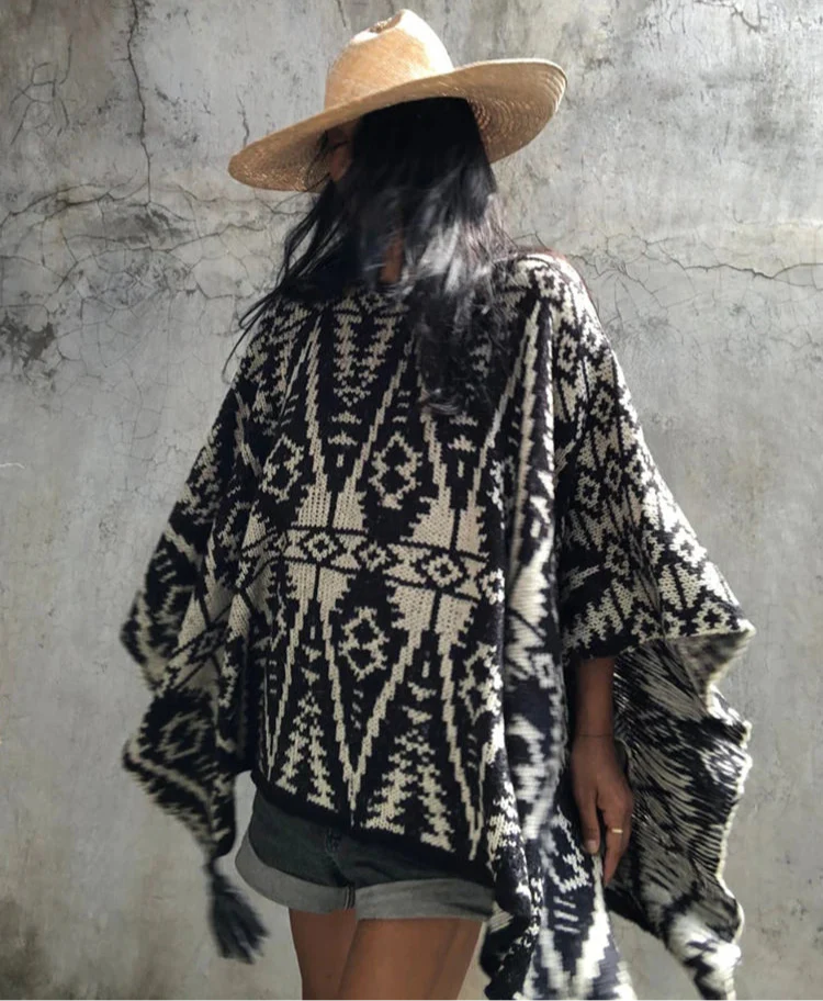 Un poncho qui ne passe pas inaperçu ? Avec cet imprimé aztèque noir et blanc, impossible de se fondre dans la masse. Les motifs géométriques attirent l’œil sans qu’on ait besoin d’en rajouter.