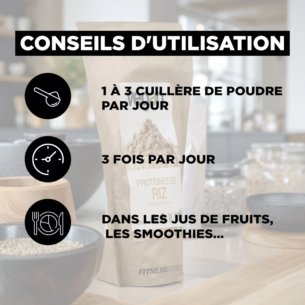PROTEINES DE RIZ de FitnessBoutique Vegan sont des protéines végétales de grande qualité et à l’assimilation et la digestibilité parfaites.