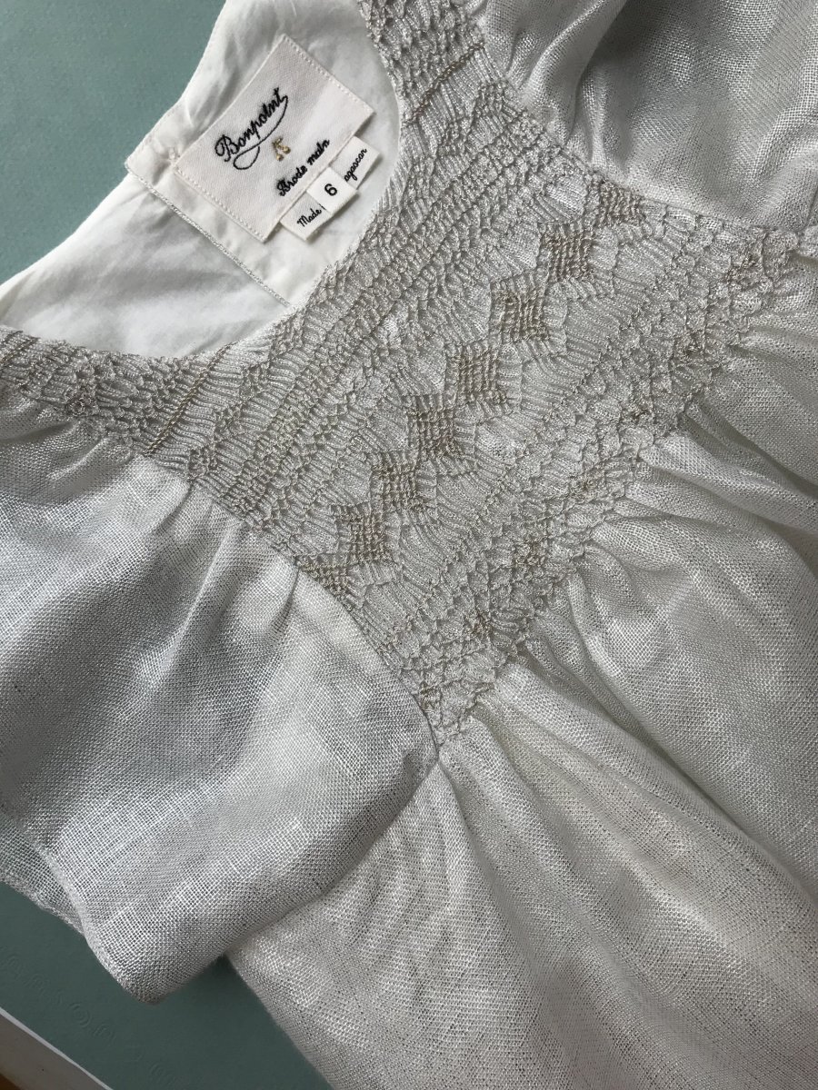 Robe de cérémonie blanche en lin, smocks argentés, boutons nacre et strass au dos. Se porte dessous du genoux – Modèle « Cristina » – Collection Couture