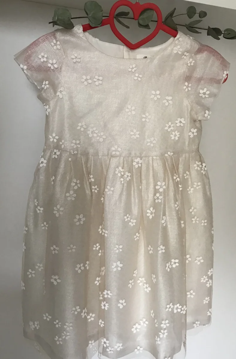 Robe de cérémonie blanche en tulle irisé légèrement rosé, petites manches, petites fleurs en gomme en surimpression sur toute la robe, boutons de nacre et strass au dos Bonpoint Couture Taille 8 ans Tulle comme neuve A louer pour 4 jours Notre avis : Gros coup de coeur pour cette merveille de robe qui résume […]