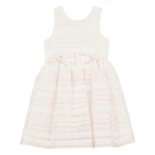 Robe de cérémonie , forme chasuble, craie à rayures roses, sans manches, noeuds sur le devant, décolleté V dans le dos, fermeture éclair invisible dans le dos, nacre signature Tartine et Chocolat