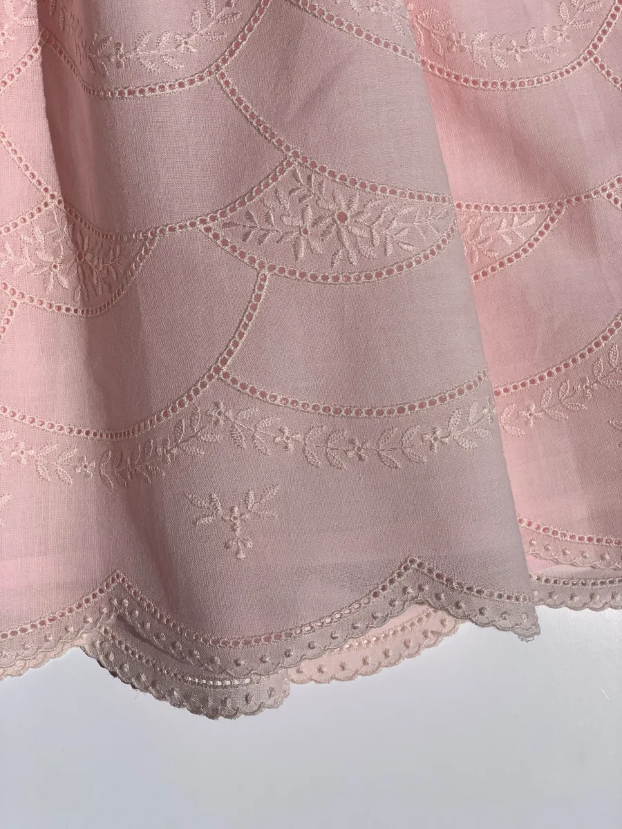 Robe de cérémonie rose pale, fluide, manches volants, broderies, 100% coton