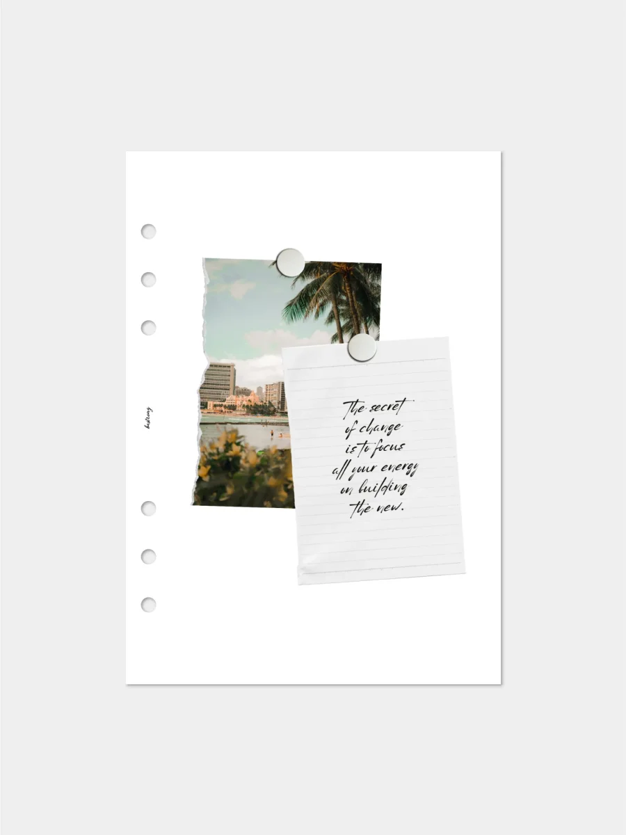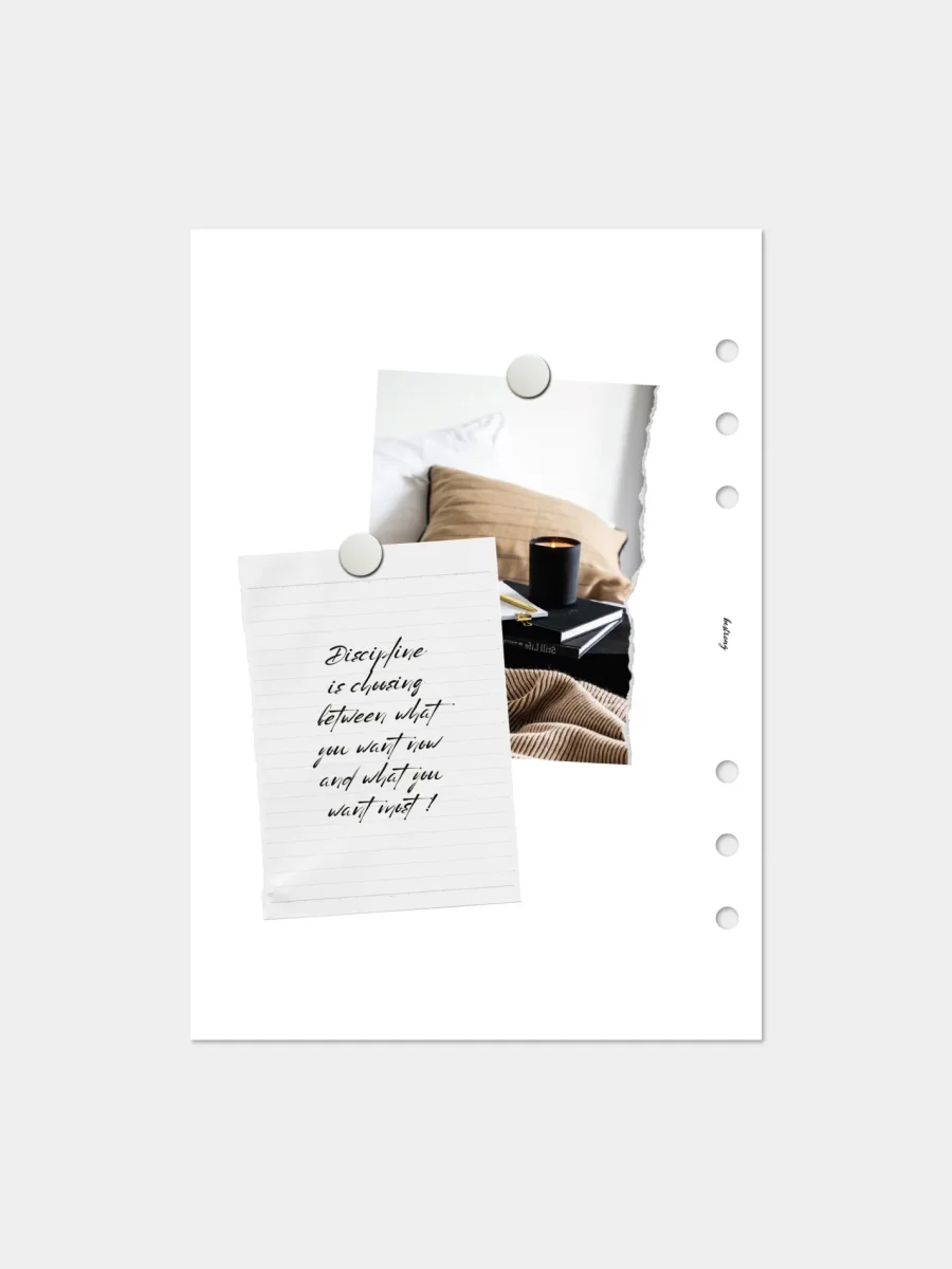 Personnalise ton planner avec ce set de pages graphiques : phrases inspirantes et photographies qui rendront ton planner Aesthetic et unique. Description : A5 Perforé Recto-Verso 1 set de 6 pages 3 feuilles