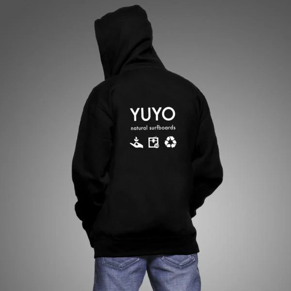 Sweat à capuche en coton biologique modèle unisexe, cordon de serrage et poche ventrale marquage Yuyo encre biologique