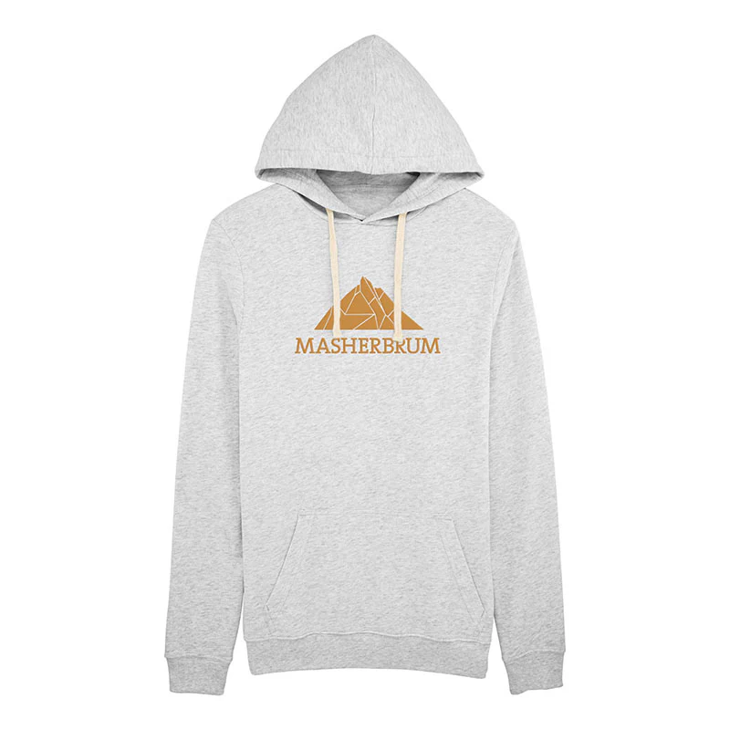 Adoptez un look de montagnard(e) urbain(e) avec ce sweat à capuche blanc chiné certifié 100% coton bio, portant le logo Masherbrum brodé en fil caramel. Grâce à son tissu léger ce sweat peut aussi se porter en demi-saison.