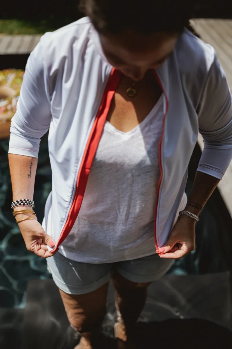 Le zip ventral permet un enfilage facile du T-shirt anti-uv Femme Homme. La languette intérieure et le retour de languette au col, couleur corail, protège le torse du contact du zip.