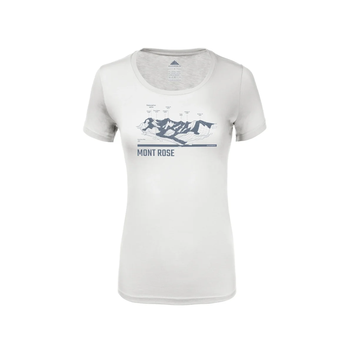 Second plus haut massif des Alpes avec la Dufourspitze (4634m), le Mont Rose est un formidable terrain de jeu pour l’alpinisme. Retrouvez-le sur ce t-shirt femme éco-responsable !