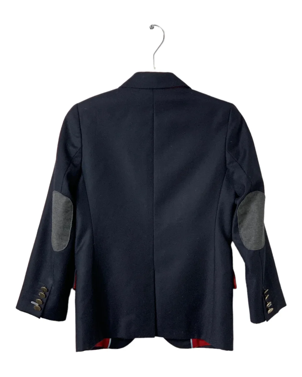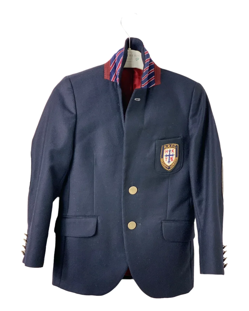 Blazer bleu marine à boutons , en flanelle, entièrement doublé, écusson brodé à la poitrine, coudières grises, Hackett 7/8 ans Laine Comme neuf A louer pour 4 jours ou 8 jours Notre avis : le chicissime blazer bleu marine pour une belle occasion !