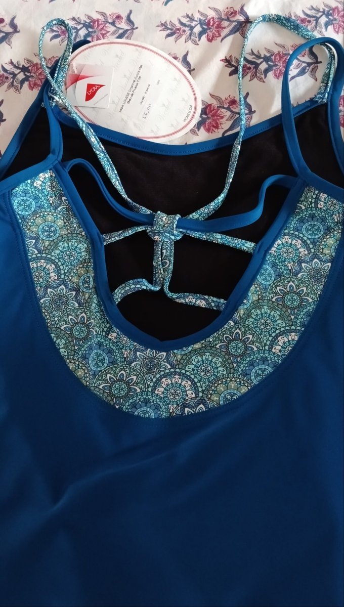 Vicard justaucorps Louise réalisé en lycra mat bleu de Prusse est un très élégant justaucorps. Les encolures avant et dos sont soulignées d’une bande de motifs géométriques formants des fleurs stylisées. La bretelle est double : bleu de Prusse et motifs géométriques. Le décolleté dos semi-profond est maintenu pas un assemblage de lanières bleu de Prusse et motifs géométriques.